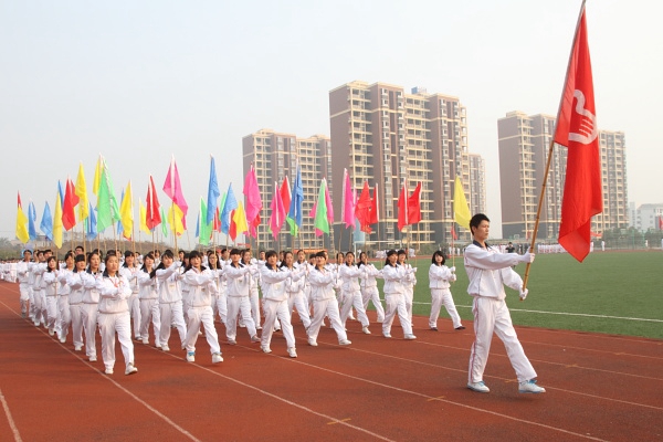 国旗护卫队、校徽护卫队、校训方阵、彩旗方阵、运动员代表队、裁判员代表队依次入场。