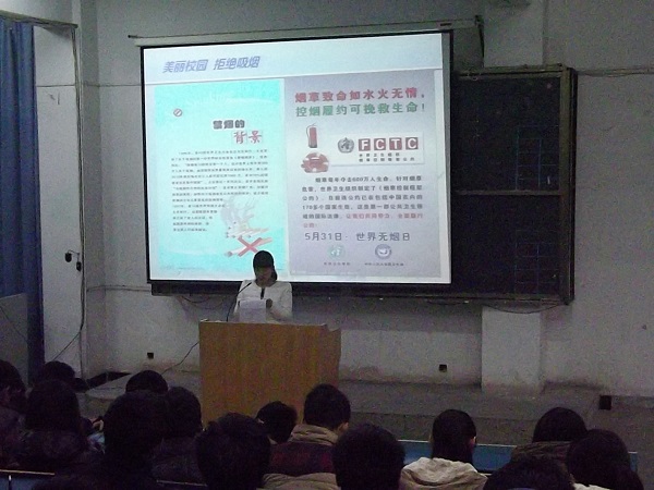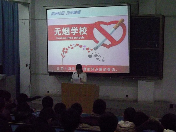 3月12日下午,机电团总支在216教室举行了“创建无烟校园,享受健康生活”的禁烟宣传活动,12、13级各班共200余名学生代表参加此次活动。 活动通过播放视频、图片等形式向同学们宣传吸烟的危害性、戒烟的重要性以及如何戒烟等知识。呼吁同学们远离香烟。在全院上下形成一股自觉抵制香烟的良好风气,倡导健康文明的生活方式,构建卫生和谐的校园。 此后,机电系团总支学生会还将成立校园禁烟巡查队,与在教学区、宿舍等地吸烟现象进行坚决斗争。(文/李承鹏)