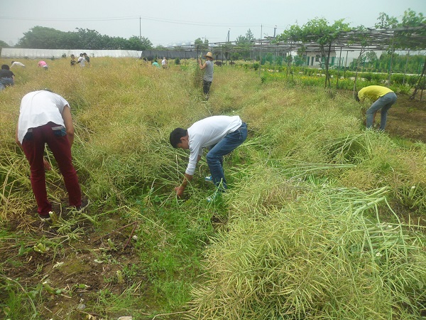 5月13日中午,顶着炎炎烈日,园林园艺系受资助同学近30人,在入党积极分子和学生会干部的带领下,来到系实训基地,帮助抢收油菜。当听到基地管理员胡师傅介绍说,由于近期雨水较多,如果不及时收割,油菜就会有很大损失的时候,同学们纷纷卷起袖管,拿起工具,不顾高温和蚊虫,投入到收割工作中去。有的同学手割破了,有的同学热得浑身湿透了,但大家相互鼓励着,没有一个同学埋怨累和苦的,很快就胜利地完成了抢收任务。望着自己劳动的成果,大家十分高兴,同学们纷纷表示,作为一名受到国家关怀和社会资助的当代大学生,就应该勤奋学习,帮助他人,回报父母和社会,为能给社会主义正能量添砖加瓦而感到自豪、骄傲。 园林园艺系历来十分重视受资助学生主题教育活动,通过公益劳动、诚信教育等形式,引导更多的同学加入到诚信立德、成长成才的道路上来,为创建和谐校园、美丽校园做出应有的贡献。