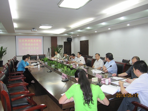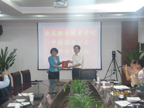 会议确定合作项目管理委员会章程,明确成员及其职责;总结2012级、2013级4个中德诺浩汽车技师班运行中存在的问题,商讨解决的对策和办法;安排2014年下半年主要工作,重点做好合作项目招生、实训室建设、师资培训、学生三段实习(见习―轮岗―顶岗);探讨中德诺浩汽车网络课程建设;研讨中德诺浩汽车学院建设,推进中德“两校三方”深度合作。中德诺浩公司负责人解读合作项目可持续发展基金设立的目的及落实措施。 为感谢许婕女士及其中德诺浩公司在双方合作项目建设上、在引进德国优质汽车教学资源和“双元制”职业教育模式上所作出的突出贡献,孙晓峰给许婕女士颁发安庆职业技术学院客座教授荣誉证书,欢迎她常来学院讲学和指导工作。