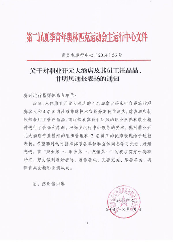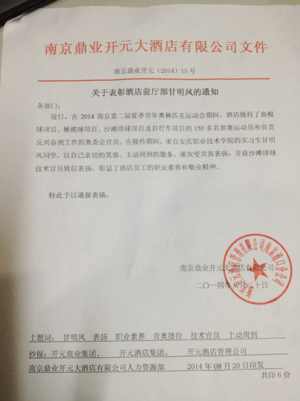 甘明凤是我院2012级酒店管理专业学生。近日,在南京鼎业开元大酒店实习的她,因在服务青奥会运动员和官员中表现出色,受到酒店和南京第二届夏季青年奥林匹克运动会主运行中心的表彰,《南京日报》载文赞她笑容亲切、服务主动周到。