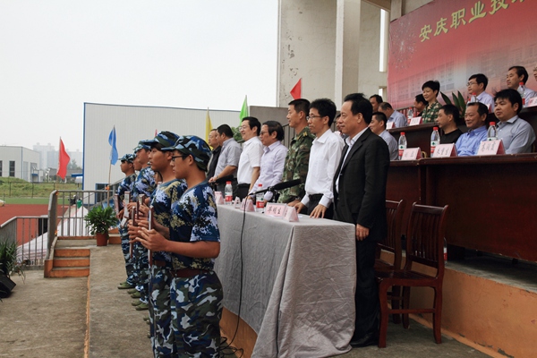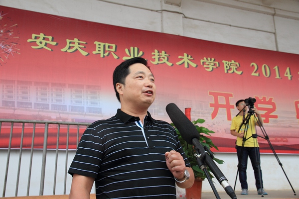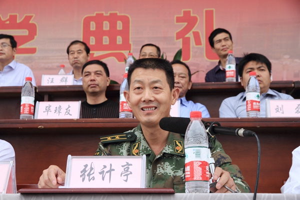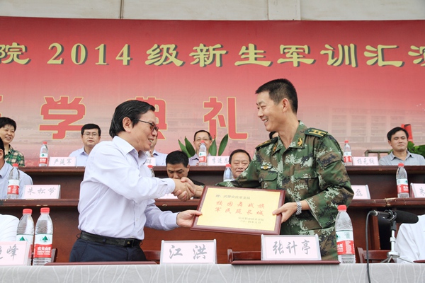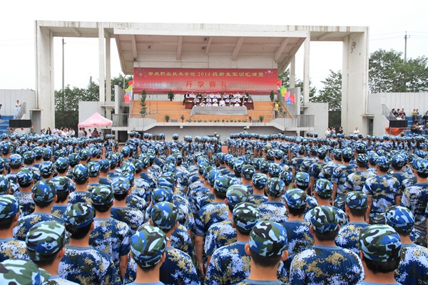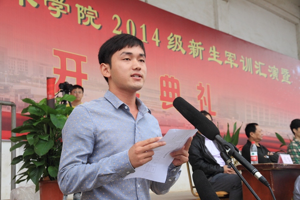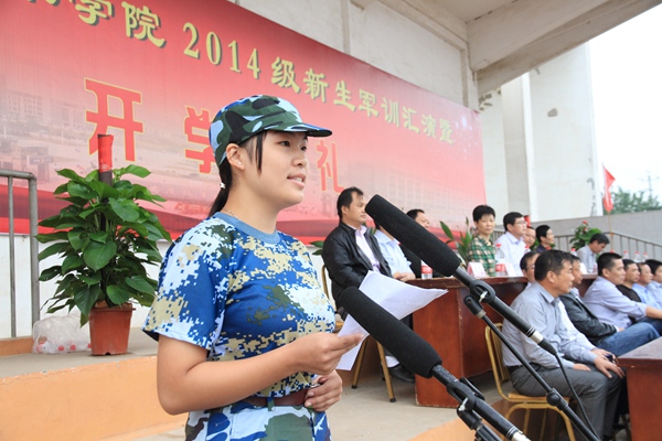 孙晓峰在开学典礼上致辞,他向承训部队和全体教官们表示衷心的感谢,向参训的2014级新同学以及所有为军训工作辛勤付出的老师们表示亲切的问候。他希望同学们志存高远,放飞梦想,树立目标,珍惜时光,学会学习,砺德砺能。他祝福新同学学习进步,学业有成,生活愉快,成为勤学笃行、德技双馨的高素质人才。 张计亭宣读了关于2014级新生军训优秀连队的表彰决定并作军训总结讲话,他对同学们在军训中的良好表现表示满意,希望同学们不断增强国防意识和军事基本素质,培养爱国主义、集体主义观念,鼓励他们在今后的学习生活中勇于拼搏,不断磨练意志、强健体魄、奋发向上。 教师代表王平作了热情洋溢的讲话。2012级学生代表何保彪、新生代表王啸笑先后发言。