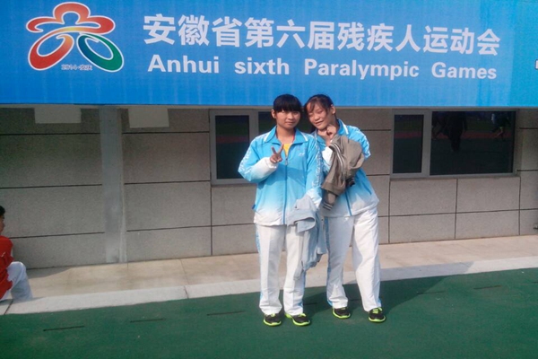 在刚刚落幕的安徽省第六届残运会上,我院社会事业系2014级电脑艺术设计专业丁楠同学,克服身体残疾诸多困难,发挥身残志坚、勇攀高峰的拼搏精神,击败竞争对手,一举夺得T38级100米、200米,F38级铅球三项冠军。 (图/石望东) 右一为丁楠