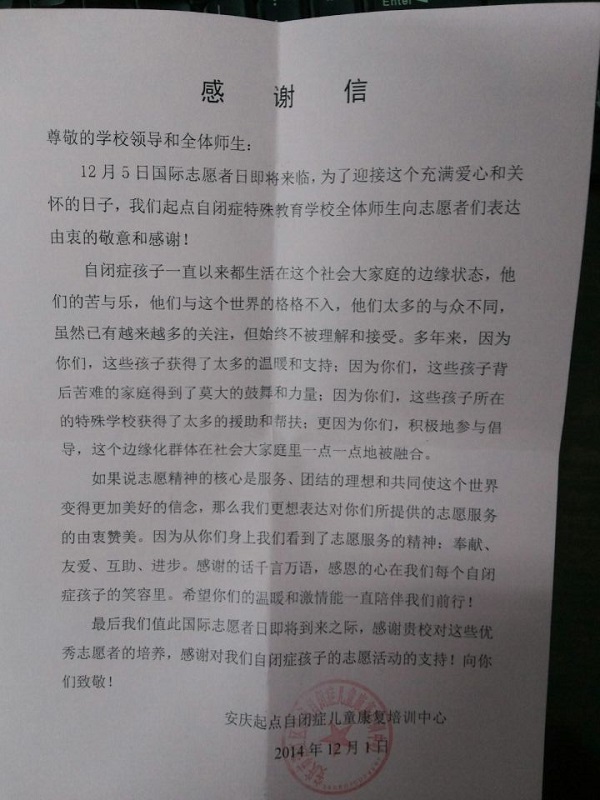 12月5日,安庆起点自闭症儿童康复培训中心陈源芳校长为社会系志愿者送来了感谢信和锦旗,感谢志愿者三年来为培训中心儿童奉献了爱心。