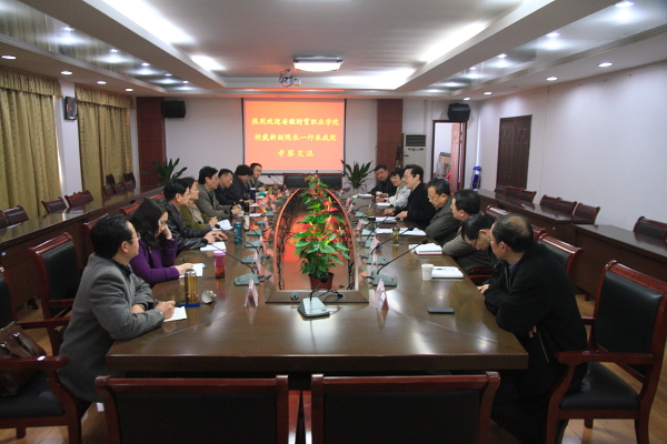 3月27日上午,安徽财贸职业学院副院长胡戴新一行八人来我院考察交流。院长孙晓峰、副院长谭维奇热情地接待了客人。 双方就高职示范建设、人才培养工作个性评估、服务地方能力建设、地方应用型高水平大学建设等问题交流了意见,交换了经验。两校系部、处室负责同志进行了对口交流。