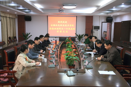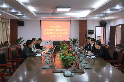 4月3日,安徽国防科技职业学院院长李麟书、副院长丁守保一行三人,安徽机电职业技术学院副院长徐春林、党委委员郑晓峰一行六人来院考察交流。院长孙晓峰、副院长谭维奇热情接待了来宾。组织人事处、教务处、招生就业处负责同志和示范办工作人员参加了对口交流。 三校就内涵建设、特色发展、服务地方能力建设、人才培养工作个性评估、地方技能型高水平大学建设等问题交换了看法,交流了经验。