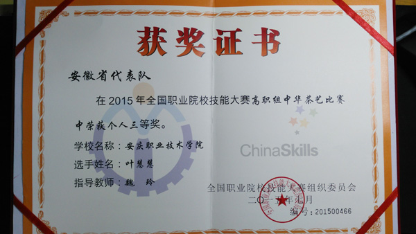 6月6日至9日,全国职业院校(高职组)《中华茶艺》技能大赛在浙江经贸职业技术学院隆重举行。我院选手叶慧慧同学沉着冷静,技压群芳,荣获三等奖。副院长谭维奇于6日前往比赛选手住地,看望并鼓励了参赛选手和指导老师。