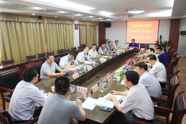 在调研座谈会上,孙晓峰简要介绍了我院示范建设以来深化内涵发展的主要举措与成效,并结合案例重点解析了我院在推进产教融合、校企合作上的一些创新性探索与实践。王进结合区域产业发展,从主动、推动、互动、联动四个方面,对政府、企业、院校三方在产教融合、校企合作中的职能和定位,提出了自己的看法。谭维奇就安庆职教联盟的运行机制和主要成效向调研组作了介绍,同时针对联盟当前面临的困难和问题提出了相关政策建议。相关系部、处室负责同志也分别向调研组介绍了实际工作中的主要举措,并针对一些困惑和问题与调研组专家进行了深入的交流和研讨。