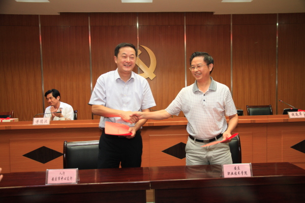 施运华与朱波代表协议双方签署《中国人民银行安庆市中心支行与安庆职业技术学院共建“征信宣传教育基地”合作备忘录》。