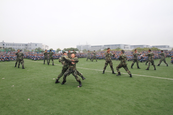 上午9点,大会在激昂庄重的国歌声中拉开帷幕。随着指挥员一声令下,3000多名新生组成的30个方队进行分列式表演,同学们迈着整齐的步伐,以昂扬的斗志、饱满的精神,依次通过主席台,展示他们的军训成果,充分表现了朝气蓬勃的大学生风貌,用优异的表现给为期两周的军训画上了圆满句号。分列式结束后,军训教官进行了擒敌拳表演,教官动作规范娴熟、刚劲猛烈、孔武有力,赢得了全场的阵阵掌声。