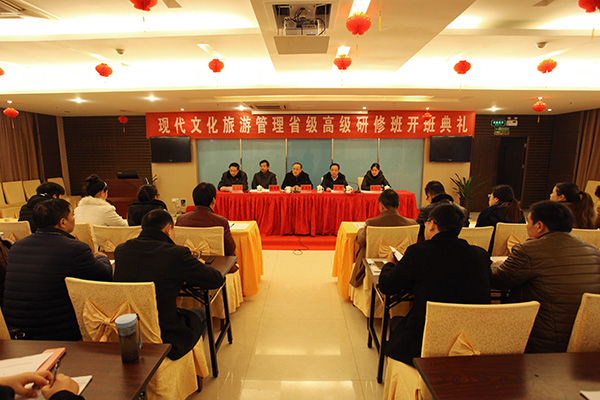 开班典礼上,占峰致欢迎词,代表我院万名师生,对参加研修班的各位领导、学员表示热烈的欢迎,并介绍了我院办学基本情况。他表示学院作为安徽省级专业技术人员继续教育基地,在省厅、市局的统一部署和具体指导下,基地建设成效显著,截止2015年,基地已建设发展成为拥有18个专业类别、51名专业教师(培训专家库)的区域一流的继续教育培训基地。此次,在我院建设地方技能型高水平大学中,迎来了此次高级研修班,这既是省人社厅、市人社局对我院的充分信任,也是对我院办学能力的充分肯定。 唐东风介绍了省人社厅、市人社局组织开展专业技术人才知识更新工程工作情况,高度肯定了我院承办本次研修班的筹备组织工作,并对参训学员提出了具体的学习要求。 院成教部在仪式上向参训学员们介绍了本次高研班的教学组织和日程安排情况。 本期培训班为期三天,分两个阶段进行。第一阶段是专题讲座。学院遴选了安庆师范大学和我院的四位教授、博士为授课教师,精选了《注入文化元素、提升A级景区质量》《旅游:新动能、新格局、新发展》《文化旅游服务质量提升》《星级酒店管理质量提升》等讲座专题。第二阶段是评定成绩、考核结业。即在完成第一阶段培训后,进行成绩评定,经考核合格,颁发省厅《安徽省专业技术人才知识更新工程培训证书》。