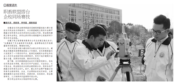 12月24日,《中国教育报》第10版“画里话外”栏目以《职教联盟搭台 企校同场赛技》为题报道安庆职教联盟首届建筑测量技能大赛。原文和图片如下: