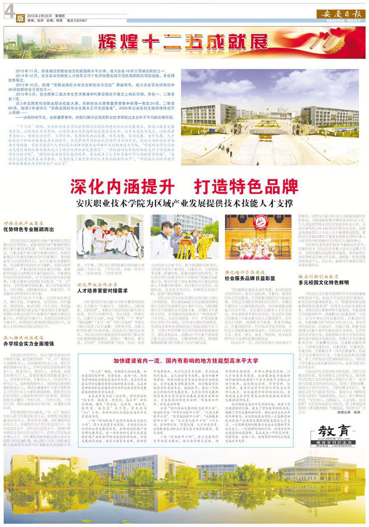 2016年2月25日,《安庆日报》“辉煌十二五成就展”栏目以《深化内涵提升 打造特色品牌 安庆职业技术学院为区域发展提供技术技能人才支撑》为题,专题报道我院“十二五”时期改革发展情况,并介绍我院“十三五”时期加快建设地方技能型高水平大学的思路和举措。 全文如下: