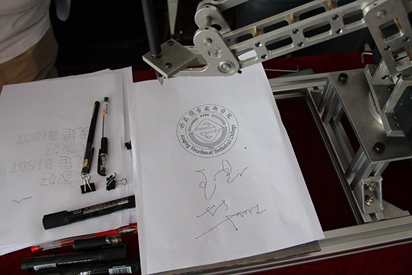 一批科技发明制作实物格外显眼。毕忠梁老师自主研制的Bibot ARM桌面机器人是一款会写会画,会抓会放,会激光雕刻,会3d打印,会陪你下棋,会给你倒水智能型机器人,它现场再现院领导们的签名让人叹为观止;刘畅老师指导的云――自控现场温度冷却系统可以为企业用户提供低成本的环境温度控制,利用物联网云端控制技术实现了在普通智能手机上实时的画面监控和远程开关控制;汽车专业则带来了手动快速惯性拆装扳手、日间行车灯、发动机冷却液流向控制阀及精彩的维修、销售视频;数控加工类中,惟妙惟肖的中国龙、弥勒佛;模具类用线切割工艺制的logo,3D打印的花篮、联动齿轮等作品让经过的学生在体验中不觉赞叹,科技大牛就在身边。