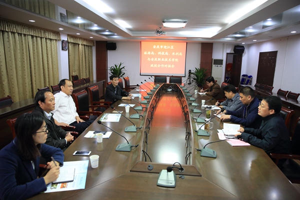 10月21日,迎江区科技局局长江兴枝、民族宗教事务与旅游局局长胡宗志、水利局局长汪文新一行来我院,就细化、实化校地合作进行对接。