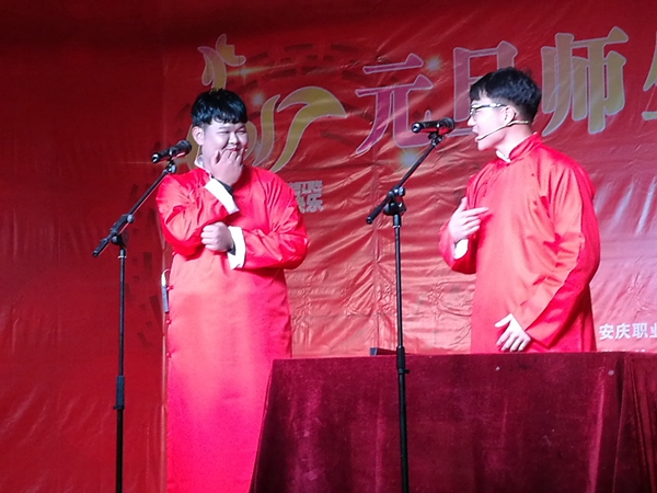 晚会在青春热舞《向快乐出发》中拉开帷幕。歌曲《光辉与友情岁月》、《小城故事》、《一万次悲伤》,师生分别演绎经典、向经典致敬;吉他弹唱《春风十里》娓娓道来诉说大学生美好的情愫;传统相声表演《我要上元旦》中捧哏、逗哏技巧表演得淋漓尽致;原创小品《奇葩招聘会》立意高,师生联袂表演凸显了大学生就业中面临的问题,教育学生在校期间要把握大好时光好好学习;服装及礼仪展示《古往今来・服装礼仪秀》、茶艺表演《茶香悠悠》呈现了学生良好的专业素养,给观众带来美的享受;教师黄梅戏表演《当官难》,让现场观众感受了传统戏曲的魅力和韵味;军体拳表演《永不褪色的迷彩》展现了当代军人过硬的军事素养和良好的精神风貌;动感充满张力的舞蹈《三元素空间》、蒙族传统筷子舞《欢哥》、传统武术及舞狮表演《武・狮》更是嗨爆全场。