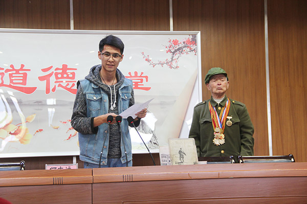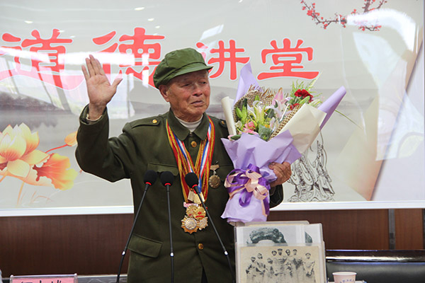 4月27日,八十七岁高龄的“红色经典”宣传员何志城走进我院,在图文信息楼三楼学术报告厅作“道德讲堂之红色经典爱国主义教育”专题讲座。学生处(团委)负责同志、相关系部辅导员、教师及学生代表200余人聆听了本次报告会。