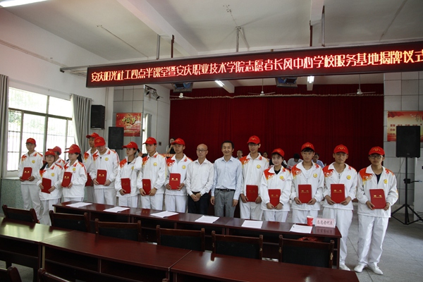 为营造迎接党的十九大胜利召开的良好氛围,根据教育部、中宣部、共青团中央、中华职业教育社《关于做好2017年职业教育活动周相关工作通知》、《安庆市2016年推进社会力量参与基本公共服务若干政策》文件要求,贯彻落实“一学一做”教育实践活动精神,为培养大学生社会责任感,弘扬“奉献、友爱、互助、进步”志愿服务精神,在政府、学校的大力支持下,经协商沟通,安庆职业技术学院、长风中心学校、安庆阳光社工服务中心共同建设留守儿童“四点半课堂”志愿服务项目,同时安庆职业技术学院、长风中心学校、阳光社会服务中心共建我院青年志愿服务基地。活动开始,长风中心学校校长、阳光社工理事长致辞,并分别对长风中心学校和阳光社工服务中心以及留守儿童“四点半课堂”项目做了详细介绍。