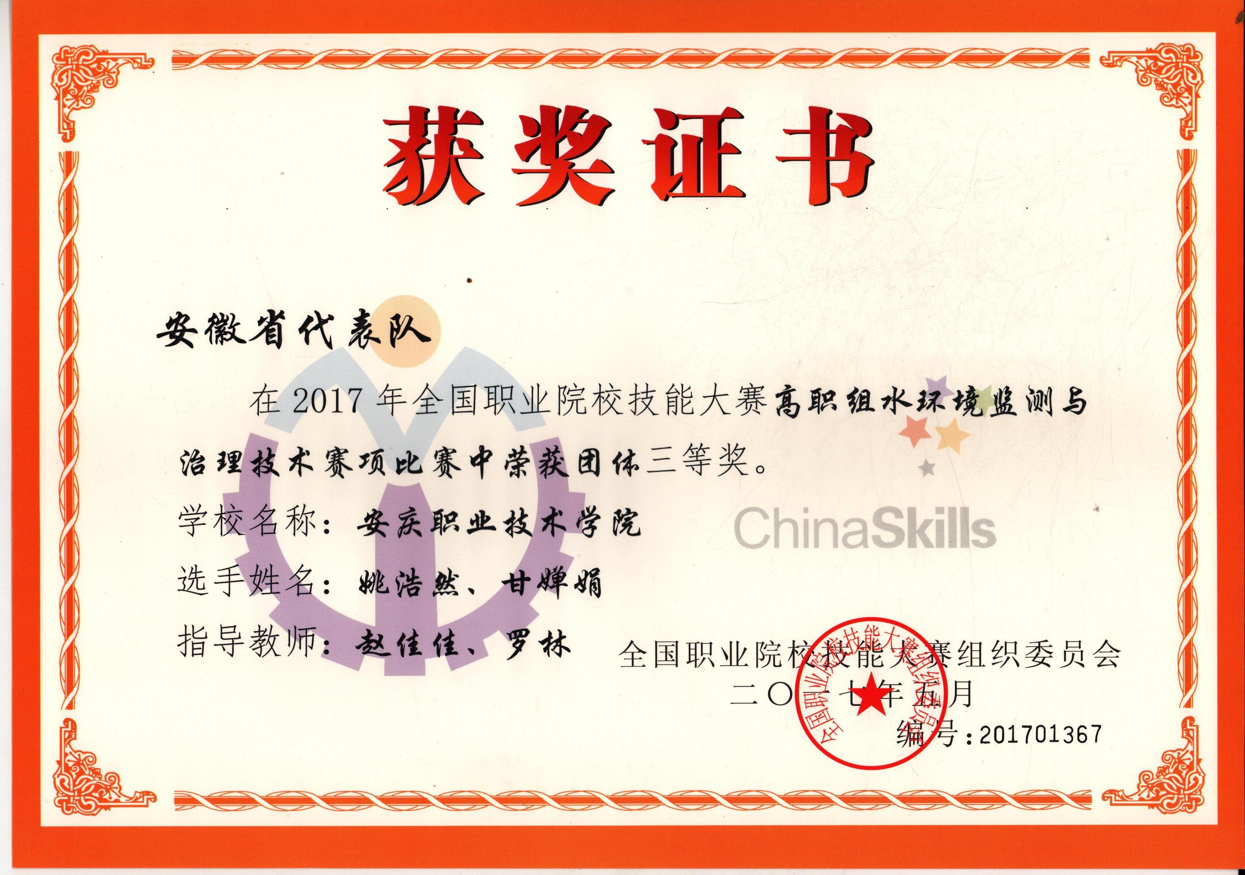 5月11日至14日,全国职业院校(高职组)技能大赛《水环境监测与治理技术》项目在天津现代职业技术学院举行。参加本次比赛的共65个参赛队,我院环境监测与治理技术专业姚浩然、甘婵娟两位同学沉着冷静,经过5小时的表现,荣获该项目的三等奖。