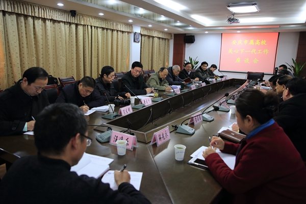 12月12日,市属高校关心下一代工作座谈会在我院召开。市关工委主任张世云,副主任蔡文中、周普福,办公室主任冯箭,安庆市高教工委负责同志出席会议。我院党委书记王进主持会议。安庆医专党委书记杨金奎、安徽黄梅戏职院纪委书记张双伍、桐城师专纪委书记陈发明、安庆职业技术学院纪委书记方天祜出席。我院关工委主任余祖文、组织人事处负责同志参加会议。