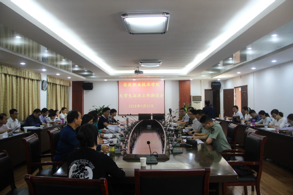 为深入贯彻落实教育部、军委国防动员部全国大学生征兵工作网络视频会议和全省大学生征兵工作推进会精神,进一步做好我院大学生征兵工作,5月23日上午,我院在综合办公楼第二会议室召开2018年大学生征兵工作推进会,院党委委员、副院长毕明生主持会议,迎江区区委常委、人武部部长黄文镜出席会议并讲话,迎江区人武部副部长王飞、院征兵工作站全体成员、各系征兵工作联系人和全体专职辅导员老师参加会议。