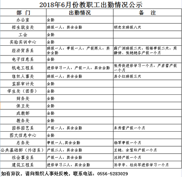 根据学院文件规定,经各部门提交的教职工考勤表,组织人事处统一汇总,现就2018年6月份教职工出勤情况公示如下: