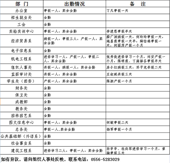 经各部门提交的教职工考勤表,结合学院考勤系统数据,组织人事处统一汇总,现就2018年12月份教职工出勤情况公示如下: