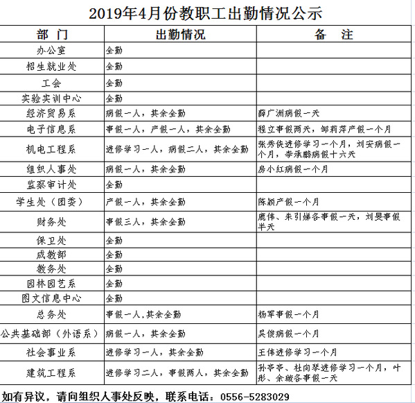 经各部门提交的教职工考勤表,结合学院考勤系统数据,组织人事处统一汇总,现就2019年4月份教职工出勤情况公示如下: