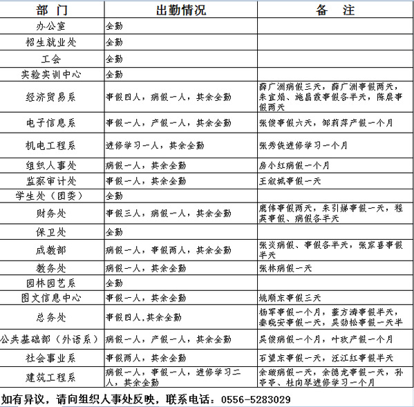 经各部门提交的教职工考勤表,结合学院考勤系统数据,组织人事处统一汇总,现就2019年6月份教职工出勤情况公示如下: