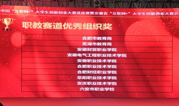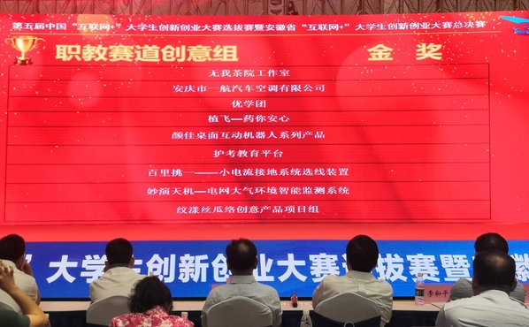 8月8日,第五届中国“互联网+”大学生创新创业大赛选拔赛暨安徽省“互联网+”大学生创新创业大赛颁奖典礼在合肥学院顺利落下帷幕。本届大赛共有160余所学校、3.7万个项目、15.5万人次参赛,我院“节”空调——安庆市一航空调有限公司项目获职教赛道金奖,另有两个项目获银奖、五个项目获铜奖,学院被授予职教赛道优秀组织奖。