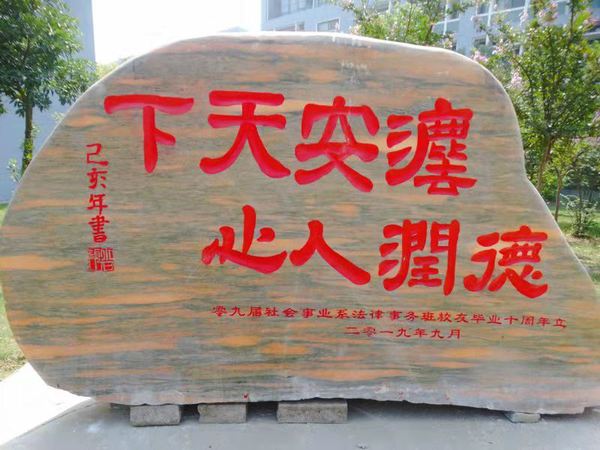 拳拳赤子心,滴滴似水恩。在2019年9月9日这个特别的日子里,2009届社会事业系法律事务班校友毕业十周年后重聚母校,感怀母校恩情,畅叙师生情谊,追忆青春岁月,为母校捐赠镌刻有“法安天下、德润人心”8个大字的文化石。院党委委员、宣传部长沈良生,2009届法律事务班辅导员余汶桦、社会事业系党政管理干部出席文化石揭幕仪式仪式,该系全体专职辅导员、学生代表参加了本次活动。