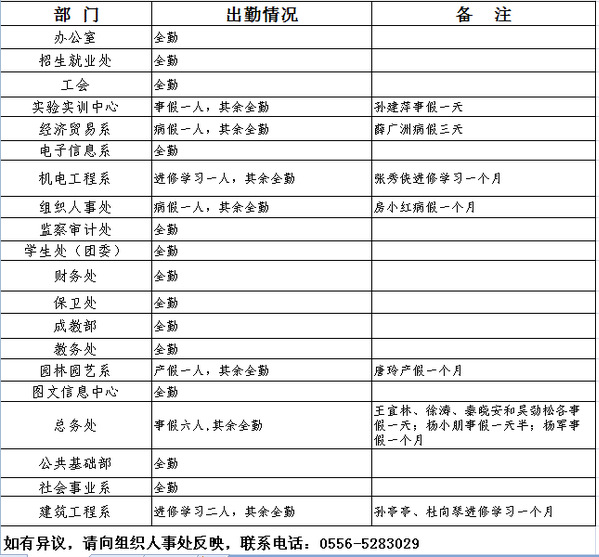 经各部门提交的教职工考勤表,结合学院考勤系统数据,组织人事处统一汇总,现就2019年10月份教职工出勤情况公示如下: