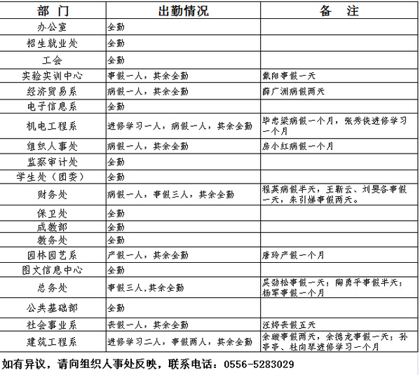 经各部门提交的教职工考勤表,结合学院考勤系统数据,组织人事处统一汇总,现就2019年11月份教职工出勤情况公示如下: