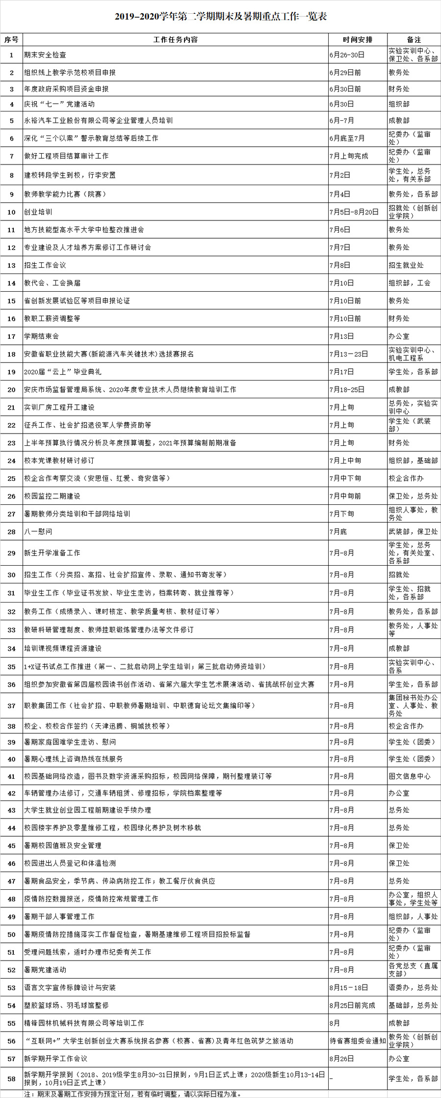 2019-2020学年第二学期即将结束,为确保各项工作顺利进行,现将期末和暑期有关工作安排通知如下: