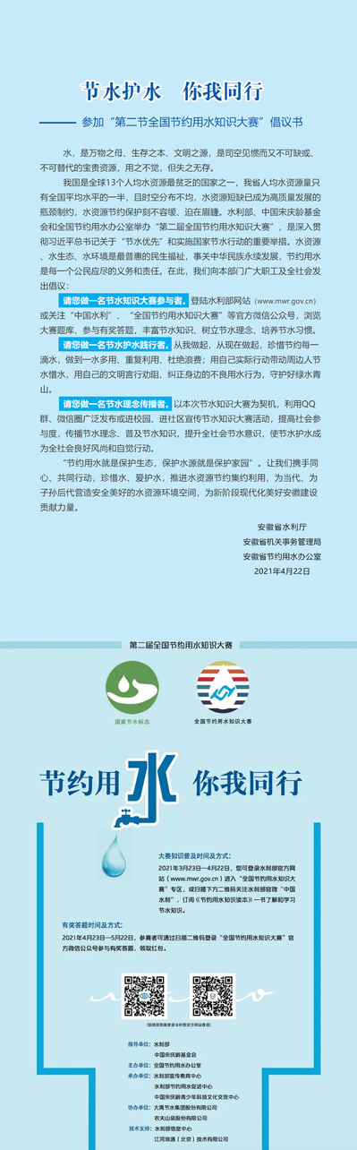根据安徽省水利厅、安徽省机关事务管理局、安徽省节约用水办公室下发通知,为营造全校师生的节水氛围,树立绿色文明意识、生态环境意识和持续发展意识,促进全校师生在日常生活中养成良好的用水习惯。我校将开展“第二节全国节约用水知识大赛”活动。