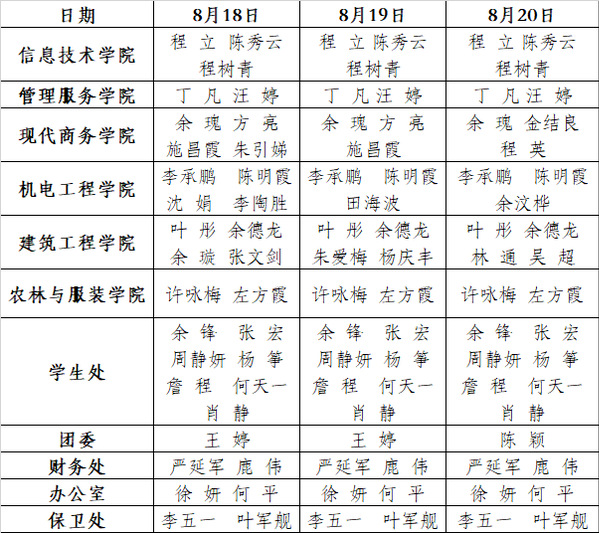 为做好2021年秋季大学生征兵工作,方便学生办理有关手续,结合我校工作实际,应征入伍学生的政治考核、学费资助、新兵档案等工作集中安排在8月18、19、20三天办理,各二级学院务必提前通知到有关学生。征兵工作值班见安排表。