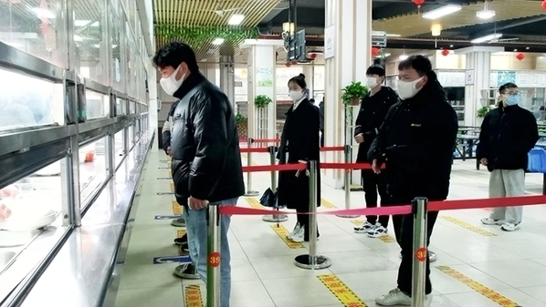 就餐模块,学生按要求保持1米间距排队进入食堂,经体温检测及洗手消毒后前往售卖窗口处购餐,选择打包或堂食,按照规定路线离开餐厅。