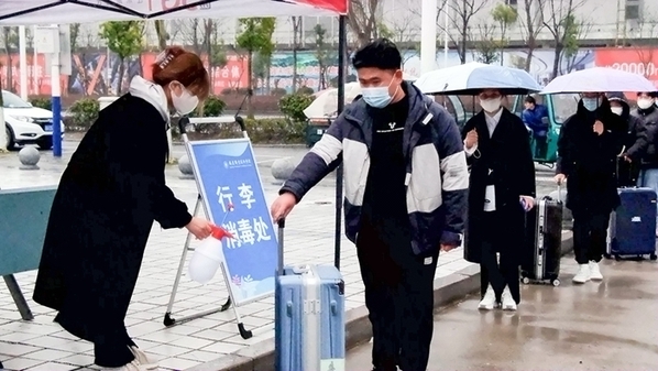 在学校大门口,专业消杀人员对学生携带行李进行全面消杀,学生领取口罩,按照地贴位置间隔1米排队等候。入校人与需测试体温,出示身份证件、学生证、安康码及行程码核验方可入校。出现异常者,将由专人将其带至临时观察区进行复查,并依据学院疫情防控工作方案和师生发热应急处置预案迅速采取隔离上报等措施,确保入校安全。