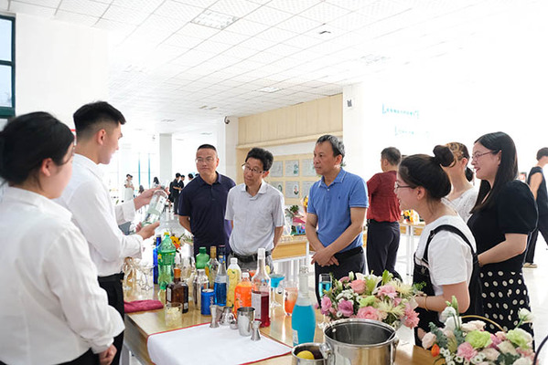 酒店管理专业舒家乐同学,为参展师生详细介绍了“龙舌兰日出”、“玛格丽特”等鸡尾酒的调制过程和创作者背后的故事传说。童宏葵听完介绍后,肯定了舒家乐同学扎实的专业基础和展示能力,并鼓励他继续学好专业技能,做新时代的能工巧匠。