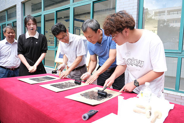 活动现场,数字媒体艺术设计专业邓浩宇同学,向参展师生演示了版画制作的过程。童宏葵和毕明生观看后,饶有兴趣地带上一次性手套,按照演示的步骤,先用油滚粘上油墨在雕刻着版画的油墨板上均匀上色,再用特殊粗糙面的纸张覆盖上去,用马莲蘑菇拓施力,在纸张上完成拓印,体验了版画的制作过程和技术要点。