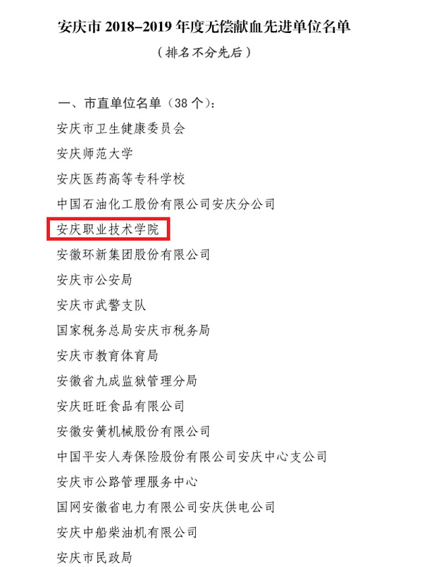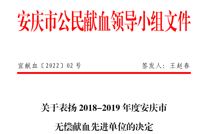 6月13日,安庆市公民献血领导小组印发了《关于表扬2018-2019年度安庆市无偿献血先进单位的决定》,授予我校无偿献血先进单位。