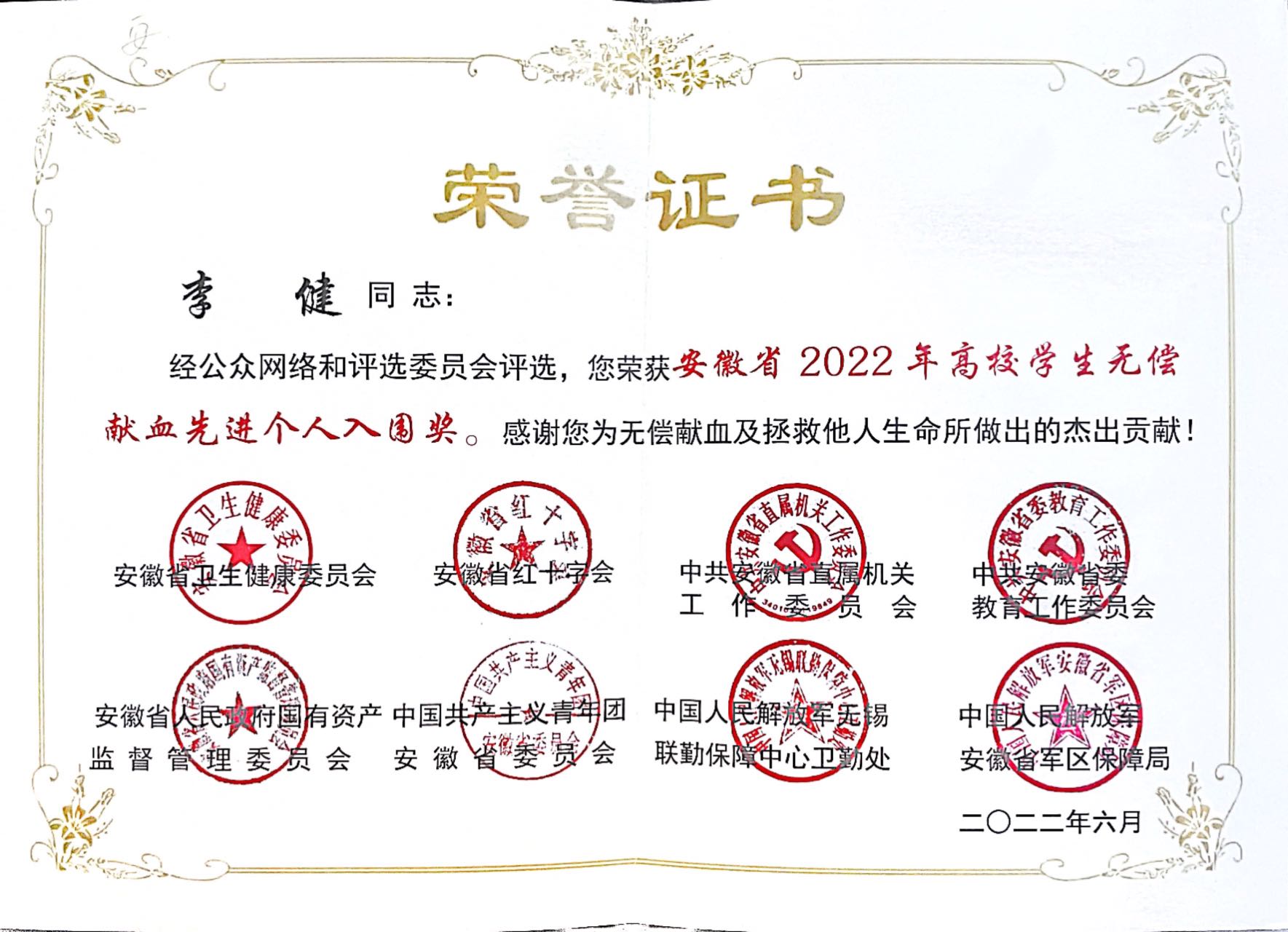 在安徽省卫健委、安徽省红十字会、共青团安徽省委等八部门联合组织开展的安徽省2022年高校学生无偿献血先进个人评选中,我校青年志愿者李健同学获得入围奖,安庆市属高校仅三人入围。