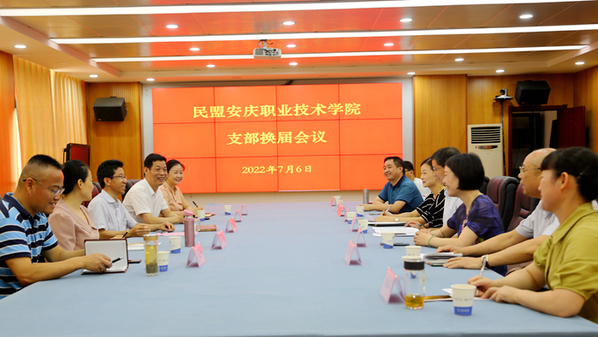 7月6日下午,民盟安庆职业技术学院支部召开换届工作会议,安庆职业技术学院党委副书记、校长毕明生,民盟安庆市委会主委毛以成,民盟安庆市委专职副主委杨洋,秘书长吴敏,学校统战部部长李五一出席会议。安庆职业技术学院全体在职盟员参加会议,上一届支部主委段春晖主持会议。