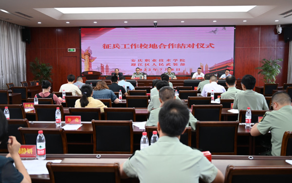 为更好落实军地协同征兵的工作要求,切实做好2022年秋季征兵工作,7月8日下午,我校与迎江区人民武装部举行征兵工作校地合作结对仪式。迎江区委常委、人武部部长黄文镜出席仪式并讲话。校党委委员、统战部部长李五一,学生处(武装部)负责同志,各二级学院学生管理工作负责同志,迎江区各乡镇街道武装部长和部分教师代表参加活动。