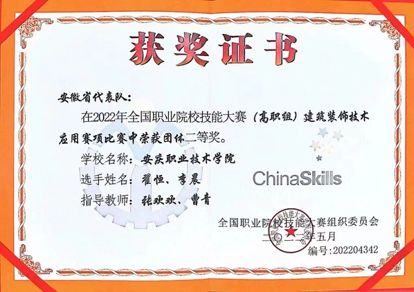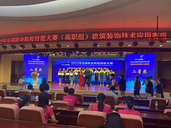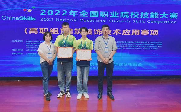 8月27日我校张欢欢、曹青老师指导翟恒、李晨两位学生,在山东城市建设职业技术学院举办的2022年全国职业院校技能大赛高职组“建筑装饰技术应用”赛项中喜获团体二等奖。