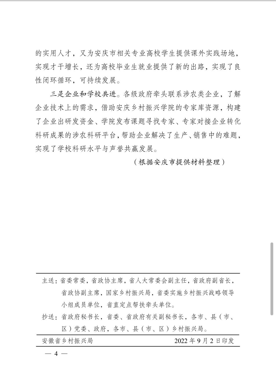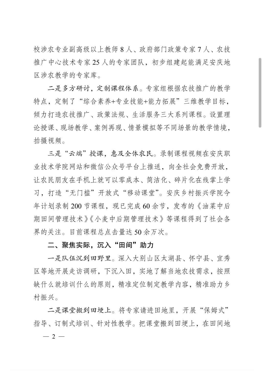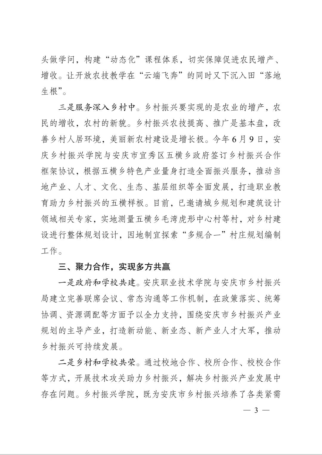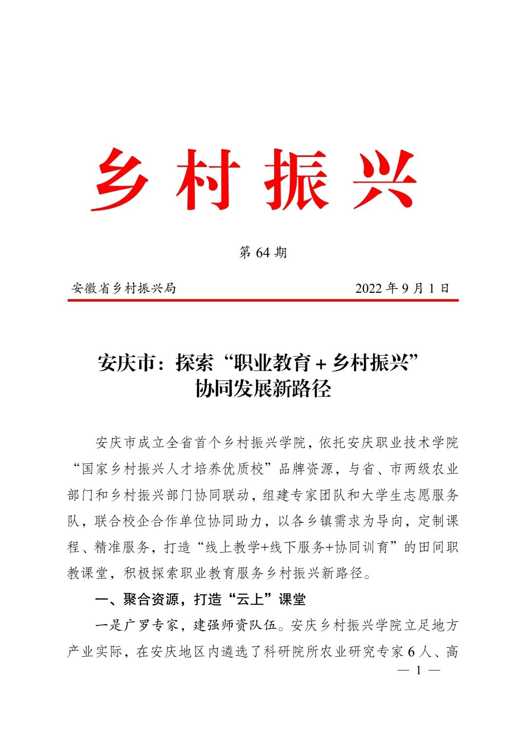 9月1日,安徽省乡村振兴局在第64期《乡村振兴简报》中刊登了我校开展乡村振兴培训的报道。《简报》肯定了我校依托安庆市乡村振兴学院平台,聚合资源、聚焦实际、聚力合作,积极探索“职业教育+乡村振兴”协同发展新路径,推动安庆市乡村振兴可持续发展,为全省乡村振兴工作提供了经验。