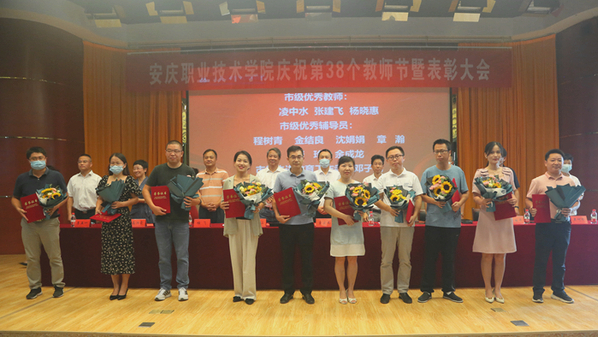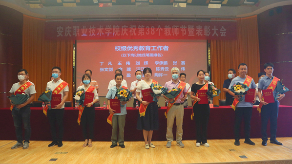 受表彰的全国职业技能大赛二等奖指导教师,市级优秀教师、优秀辅导员和先进教育工作者,校级优秀教师、优秀辅导员和优秀教育工作者代表,依次上台领奖。校领导为受表彰老师颁发荣誉证书和奖牌,并合影留念。