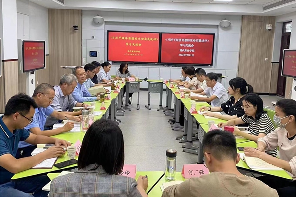 为扎实推动习近平经济思想“三进”工作,大力营造迎接党的二十大胜利召开的浓厚氛围,9月21日下午,现代商务学院召开了《习近平经济思想的生动实践述评》学习交流会,校党委委员、副校长谭维奇教授、校督导朱重生教授、王似保教授、汪全报博士及现代商务学院党总支班子成员、专业负责人等参加学习交流。
