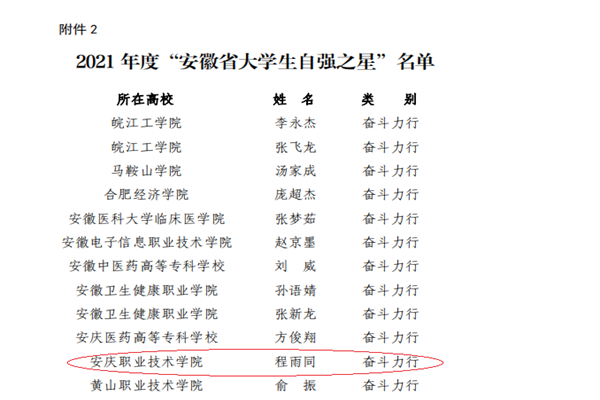 近日传来喜讯,我校现代商务学院2020级电子商务2班的程雨同同学荣获2021年度“安徽省大学生自强之星”荣誉称号,他用实际行动诠释了青春自强与奋勇争先,成为学院广大学子的优秀榜样。