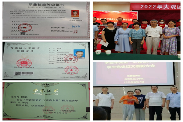 程雨同是一名患有先天性小儿脑瘫的男孩,虽然生活中遭遇重重困难,但家人、老师和同学们帮他插上了隐形的翅膀,激励他努力拼搏,勇敢飞翔。在校园里,同学们总能看到腿脚不便的他在父母和同学们的搀扶下,努力地向前行走,坚持上课。在坚持学习的同时,程雨同也从未中断过治疗,每天在父母的帮助下积极地做康复训练。不仅如此,程雨同还在参加学校庆祝建党百年校园征文比赛的文章中写到:“我的求学之路,会有一定的艰难,比一般人会付出更多的努力,但我知道,不积跬步,无以至千里,不积小流,无以成江海。”在采访中他说到:“我要认真完成大学的学业,找一份自己想要的工作,如果有能力的话,还愿意帮助别人,回馈社会,来回报社会对我的关爱”。